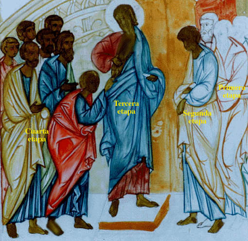 - Esta técnica está entre la técnica del temple descrita en la tercera etapa y la del dibujo con pincel. Es necesario trabajar rápidamente para que no se apoce el color y se pegue gradualmente sobre el levkas. Si eso ocurre, es necesario dejarlo secar totalmente, raspar el color mediante un cuchillo sin tocar el levkas y comenzar de nuevo. (también puede sacar la pintura con agua y pincel). Si pasa a llevar algunas líneas del dibujo, déjelas tal cual ya que tendrá que dibujarlas varias veces en las etapas siguientes.
