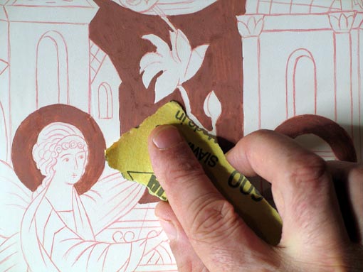 La gravure A l'aide d'une pointe à graver, délimitez les pourtours des zones à dorer. Ne gravez pas trop profondément et soyez le plus précis possible. Gravez également les inscriptions et marquez le haut du bâton de l'Archange de manière à la retrouver au travers de la dorure. N'oubliez pas le cercle des auréoles et le contour des deux têtes. |