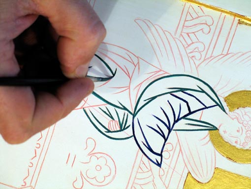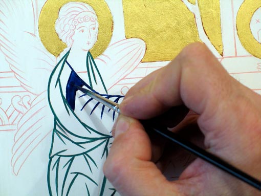 Les traits des vêtements de l'Ange La préparation de la couleur bleue: une bonne pointe de bleu outremer avec une petite pointe d'ombre brûlée. Préparez un mélange assez sec mais solide avec une bonne quantité d'émulsion. La préparation de la couleur verte: une bonne pointe de vert émeraude avec une petite pointe d'ocre rouge pour assombrir la couleur. Une bonne proportion d'oeuf - pour obtenir des traits solides - et très peu d'eau pour favorisant la précision du travail. . |