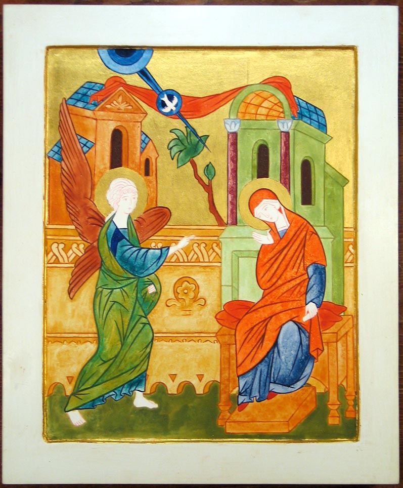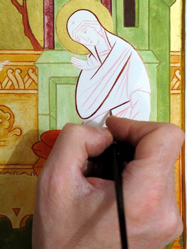 Avant d'aborder le modelé et la couleur sombre du maphorion, faites une sous couche d'ocre jaune - pour obtenir une transparence dorée - ou bien ,comme ici, une couche de fond rouge - pour des nuances rouges qui apparaîtront en transparence sous le brun. Appliquez une flaque semi transparente d'un mélange de rouge vermillon avec une pointe d'ocre jaune. |