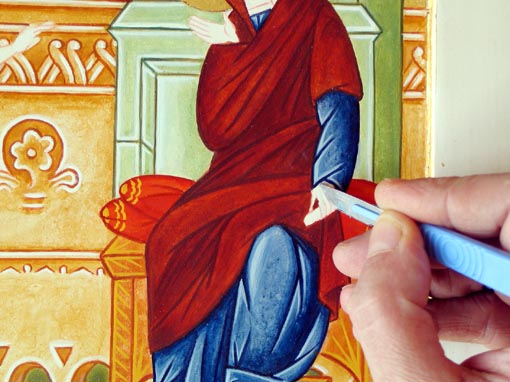 Avant de procéder à la reprise des traits de la carnation au pinceau, il est nécessaire de bien nettoyer les bavures de couleur qui peuvent recouvrir les zones de carnation. Utilisez un scalpel à lame courbe et grattez délicatement sans entamer le levkas. |