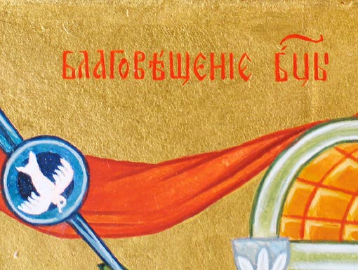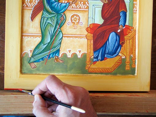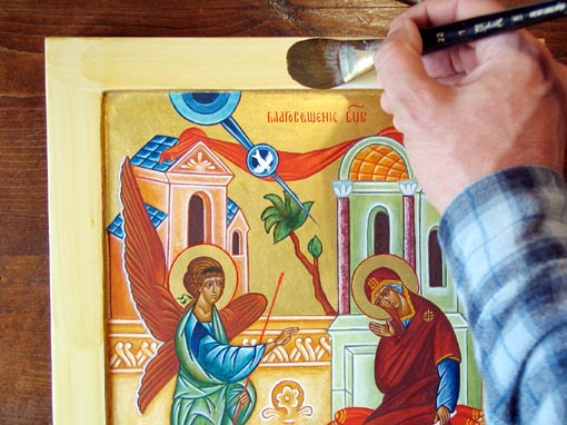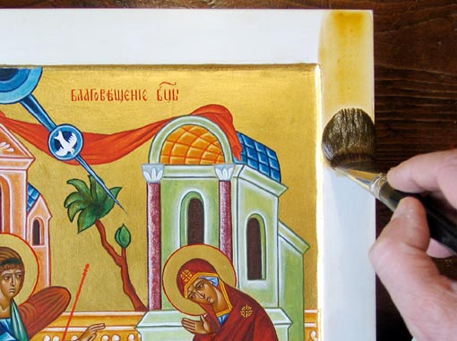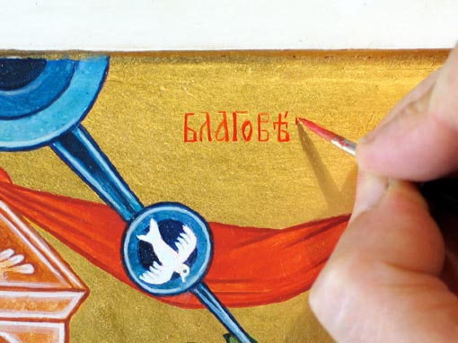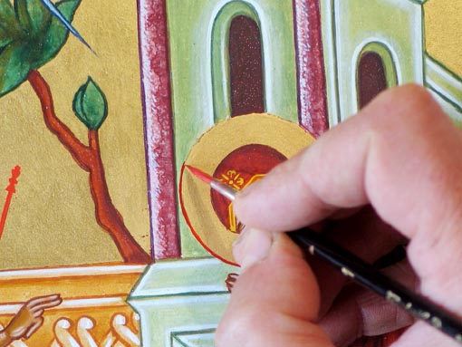 Toujours au moyen du rouge de cadmium ou du rouge de chine, tracez un filet tout autour du cadre de l'icône. Vous pouvez comme sur l'illustration ci-contre vous aider de plusieurs règles superposées pour obtenir un trait droit et régulier. |