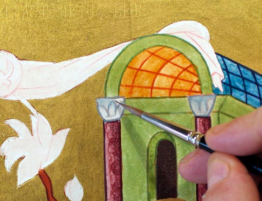| La coloration des chapiteaux Pour les traits préparez un gris bleu: une petite pointe de bleu outremer, une toute petite pointe d'ocre jaune et une pointe de blanc de titane. Pour la flaque rajoutez un peu de blanc au mélange précédent et beaucoup d'eau. Densifiez la flaque au-dessus des décorations florales pour les mettre en valeur - les faire ressortir. |