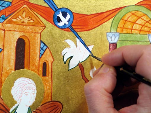Les éléments à colorer en rouge sont les suivants: la tenture tendue entre les architectures, les coussins et les escarpins de la Mère de Dieu. Couleur pour les traits: rouge vermillion avec une petite pointe de bleu outremer. Etendez une sous couche d'ocre jaune pur en flaque transparente et laissez bien sécher. Enfin appliquez une flaque de rouge vermillon pur sur l'ensemble des éléments en modelant légèrement: laissez les endroits les plus éclairés - dessus des plis - les plus transparents possible. |