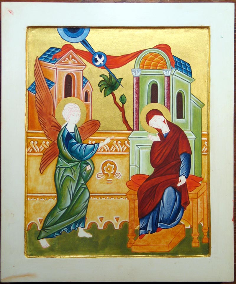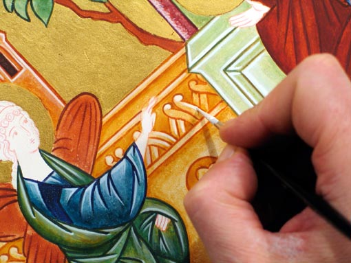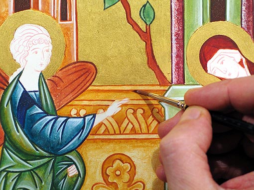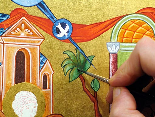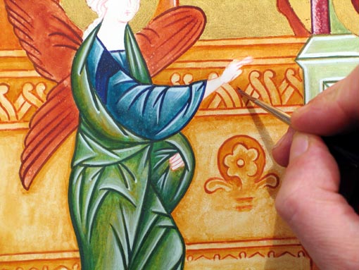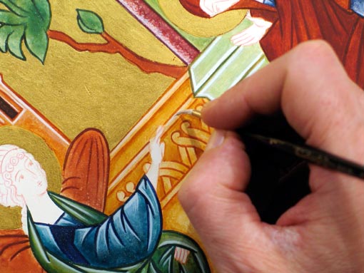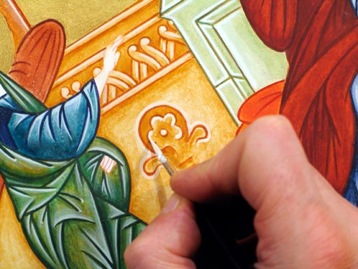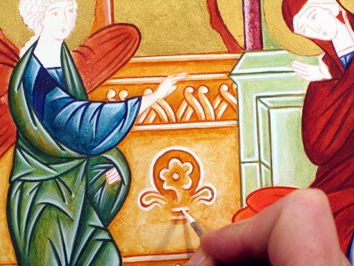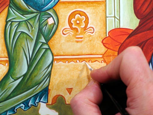 | Le premier éclaircissement Faites un mélange de blanc de plomb avec une pointe d'ocre jaune. Veillez à ce que le mélange soit assez sec et appliquez le premier éclaircissement en brossage. Cet éclaircissement doit être plus large que les traits des lumières finales qui achèveront le travail. Observez bien sur les images ci-dessous l'emplacement de cet éclaircissement... Au besoin - comme par exemple autour de la fleur - estompez ce mélange de blanc vers l'extérieur ou appliquez un film très transparent de couleur de manière à créer un halo discret tout autour de cet élément décoratif: - Prenez un pinceau large (Raphaël 8408 no 5), un peu de la couleur d'éclaircissement et rajoutez un peu d'eau et d'oeuf au mélange - Formez la pointe de votre pinceau un peu en éventail en pinçant la pointe entre votre pouce et votre index. Ecartez un peu les poils de votre pinceau en guise de brosse plate - Prenez très peu de couleur - le blanc transparent - dans votre pinceau et appliquez-la au moyen de petites touches très légères. - Nettoyez et asséchez votre pinceau puis, avec un peu d'émulsion - pinceau très sec - recouvrez cette pellicule et faites fondre un peu la couleur sur l'extérieur de la zone (estompage). |