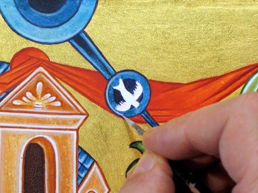 | Les éclaircissements du Ciel Première étape: préparez une couleur au blanc de plomb avec une petite pointe de bleu outremer et appliquez un premier éclaircissement sur le bas des cercles concentriques, autour de la "bulle" de la colombe et des deux côtés du rayon descendant jusqu'à la pointe. Puis passez un peu d'émulsion pour fixer la couleur et pour l'estomper un peu. Deuxième étape: rajoutez un peu de blanc de titane à votre mélange précédent et appliquez un fin trait de lumière sur les endroits pré-cités |