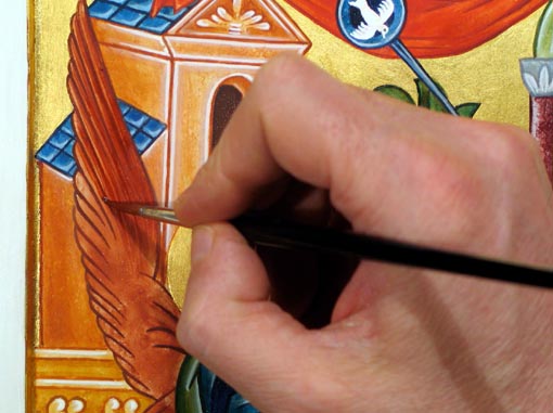 Pour terminer les ailes faites un mélange de bleu de cobalt avec une petite pointe de blanc de titane et posez la couleur du duvet tout le long de l'extrémité des plumes des ailes. Pour que la couleur adhère sur le fond d'or passez au préalable une couche de fiel de boeuf sur l'endroit à colorer. |