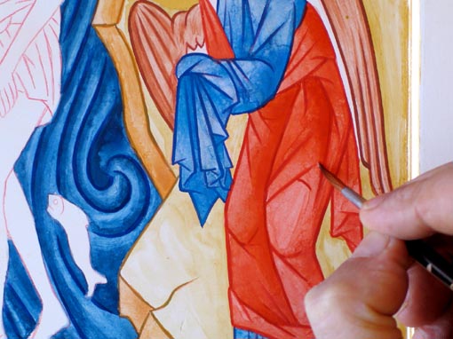 Pour ce qui concerne les trois anges à modeler reprenez les mélanges de la première couche de coloration et assombrissez-la tout en préservant les différences de nuances spécifiques des bleus, des rouges et des verts: