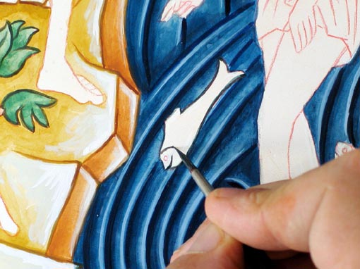 Pour les traits faites un mélange de bleu de cobalt avec une touche de vert émeraude et une petite pointe d'ombre brûlée jusqu'à obtenir un vert bouteille sombre. N'ajoutez pas d'eau à votre mélange et dessinez les traits des poissons au pinceau fin. |