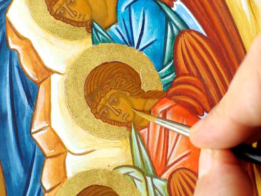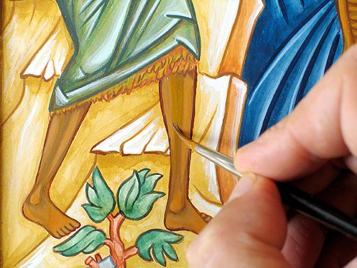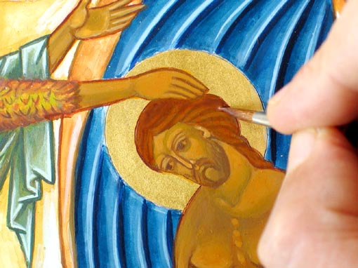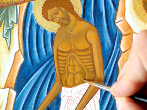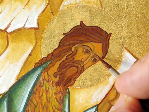 Pour effectuer ces retouches, préparez une couleur intermédaire entre le premier éclaircissement et la couleur du proplasme. Cette couleur, en général, est composée d'ocre jaune, d'une pointe d'ocre rouge et d'une pointe de vert véronèse. Faites un mélange assez sec pour pouvoir appliquer la couleur en brossage et faites de petits essais sur l'icône. Si l'essai ne vous satisfait pas, enlevez-le tout de suite avec un pinceau humide ou le doigt et modifiez votre couleur. Lorsque vous avez trouvé la bonne couleur, appliquez-la aux endroits où le proplasme reste trop sombre par rapport aux éclaircissements et laissez bien sécher. Ici nous avons dû adoucir les jambbes de Saint Jean-Baptiste et l'abdomen du Christ qui montraient un trop fort contraste de couleurs.