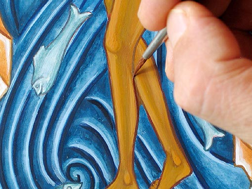 A la suite de ces retouches mais seulement lorsque les couleurs sont bien sèches, vous pouvez procéder à l'estompage des éclaircissements au moyen d'émulsion mélangé à 30% d'eau. Opérez par petites touches délicates - sans insister trop longtemps au même emplacement - et faites fondre un peu l'éclaircissement de manière à le diffuser légèrement. |