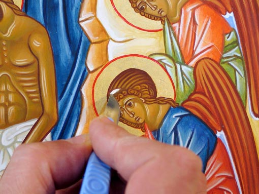 Faites trois couleurs en rapport avec les habits des anges, appliquez cette couleur à la flaque et laissez bien sécher. Nous avons choisi: bleu de cobalt, vert émeraude et rouge vermillon. Au moyen de ces trois couleurs tracez également les rubans flottant dans l'auréole (avec une couche de fiel de boeuf préalablement appliquée et sèche)