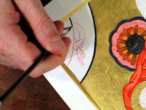 La couleur bleue de la flaque est un mélange de bleu outremer avec un peu de vert émeraude et les zones concentriques reçoivent une pointe de noir supplémentaire pour marquer le dégradé du "ciel". De plus, lors de la pose des flaques successives, les pigments sont tirés en direction du coin de l'icône (ou vers le centre imaginaire du quart de cercle).