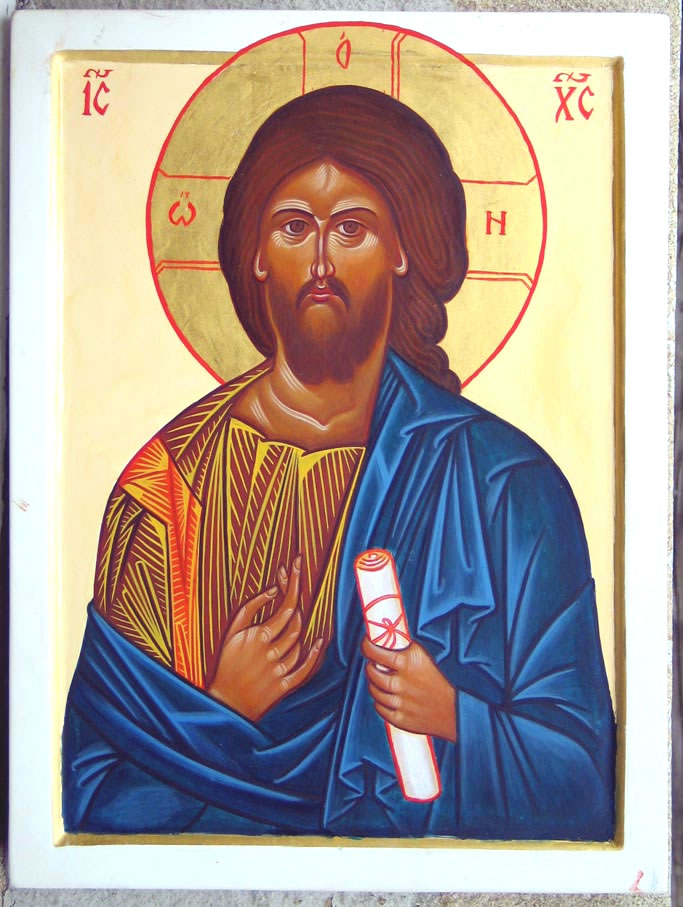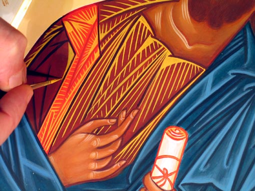 La préparation de l'assist La reconstitution de l'emplacement des traits de l'assit est un travail difficile quand l'original est détérioré mais reste capital pour bien rendre la majesté lumineuse du Pantocrator. L'agencement des traits, des zones sombres et de la lumière doivent donner au vêtement un drapé vivant et harmonieux. Il est nécessaire pour cela de bien étudier les traces de l'original (à la loupe) et d'essayer de comprendre la "logique" de l'iconographe de l'époque en recherchant des icônes dorées de la même époque et du même lieu. Nous avons fait un relevé de ce que nous pouvions discerner sur l'originale et fait des essais de reconstitution sur plusieurs calques. Les traits peuvent être tracés en blanc (plomb 90% / titane 10%) ce qui donnera une dorure plus "argentée" ou comme ici, avec de la citrine et un peu de jaune de chrome, pour obtenir un or plus "chaud". L'essentiel est que les traits soient précis et francs pour que la pose de la feuille d'or puisse s'effectuer dans les meilleures conditions possibles. |