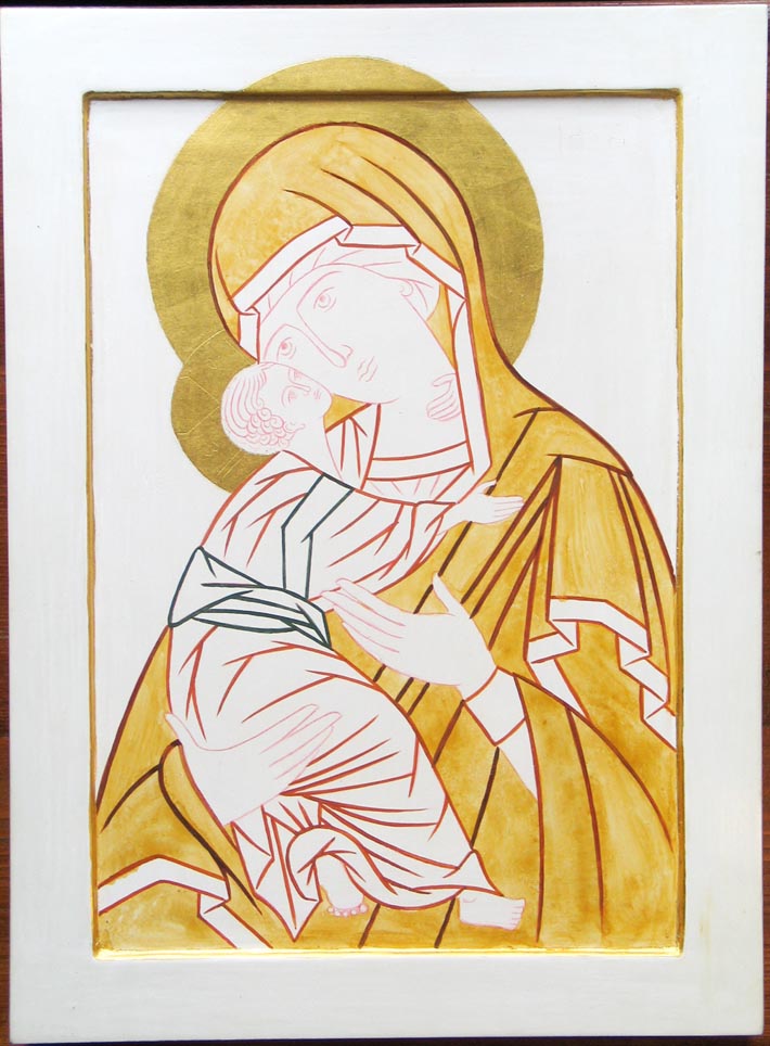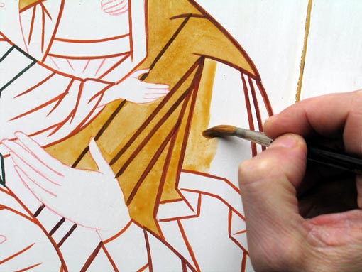 Before colouring the maphorion itself, apply an undercoat of yellow ochre. This preliminary layer will give gilded reflections to the brown coat, we will later apply, by transparency. Prepare a mixture of pure yellow ochre with a lot of water and enough emulsion. This preliminary layer must be solid as well as transparent to avoid both thickness and heaviness. Apply the colour puddle delicately, moving your brush all over the surface you want to colour.