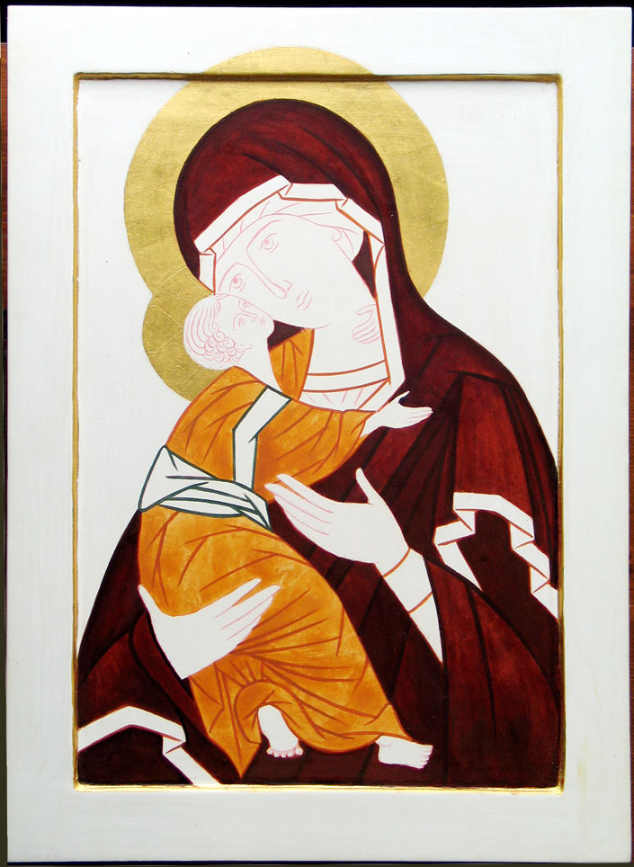 Pour donner sa couleur définitive au maphorion, préparez du rouge prune sombre à base de pigments transparents. Evitez les pigments couvrants comme le rouge de Venise par exemple qui feraient disparaître toute la transparence du vêtement. Voyez les étapes de recherche de couleur sur la vidéo ci-dessous: