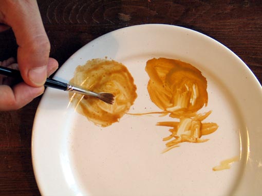 Une fois la couleur intermédiaire bien sèche, vous pouvez la modeler encore avec un mélange eau / oeuf - pinceau assez sec - pour atteindre un beau fondu des couleurs. |