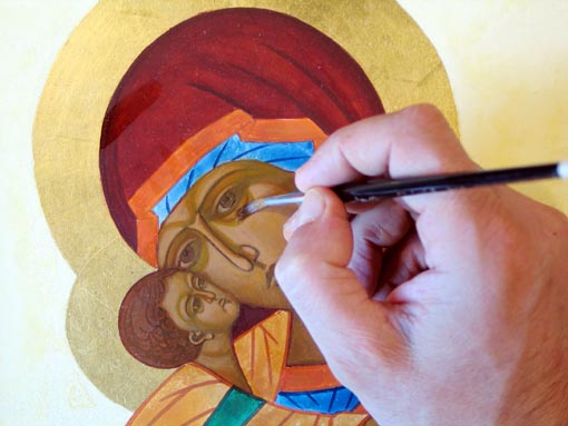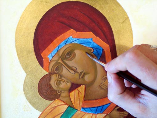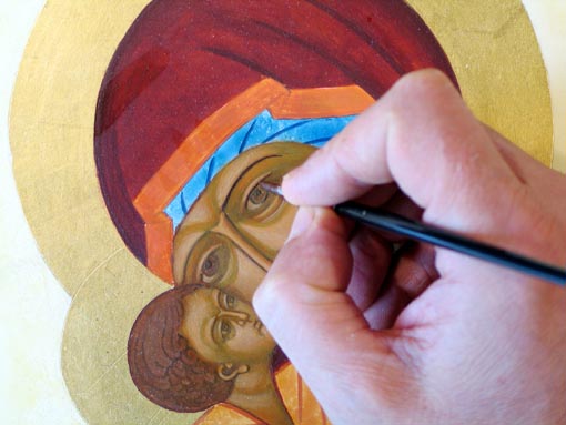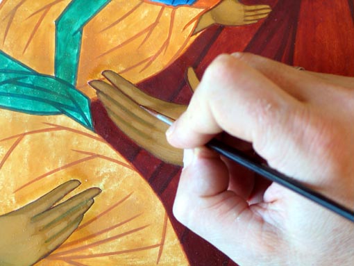 Notez que nous avons aussi appliqué une couche d'ocre jaune avec un peu de rouge vermillon sur l'ensemble de la robe du Christ pour la rendre plus homogène en vue de la pose de l'assist